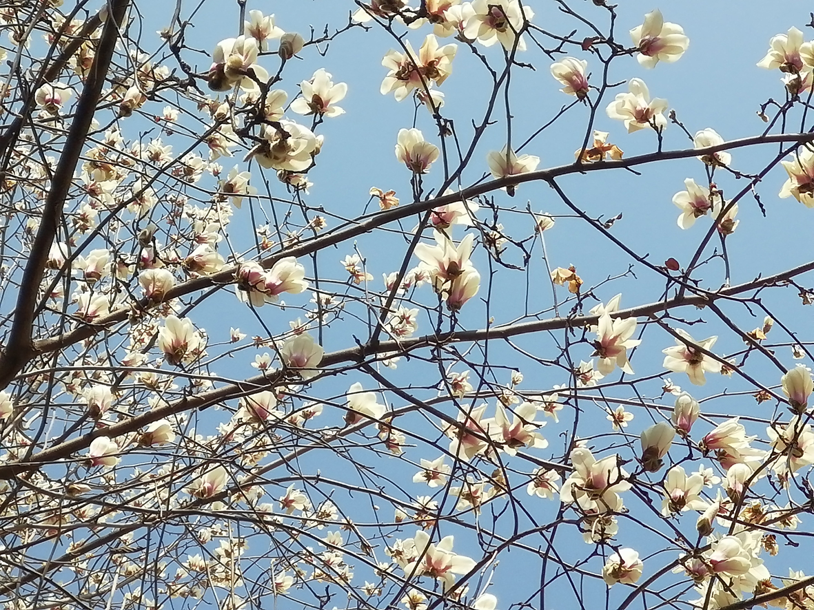 玉蘭花擠擠挨挨,一朵朵熱烈奔放,花瓣舒展明媚。如雪的白,仿佛在泉水洗滌過,片片無塵。清風徐來,花朵搖曳,千嬌百媚,姿態(tài)各異。聽,不只有風聲,還有它們啟開紅唇,向春天袒露等待和怒放的生命歷程。